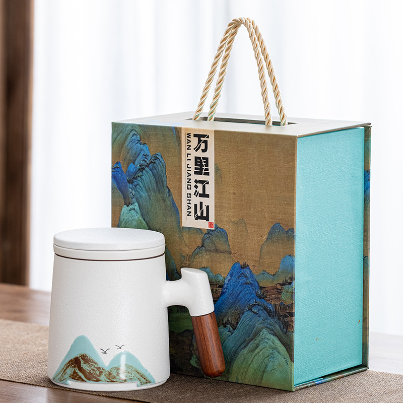 手绘万里江山办公杯茶水分离泡茶杯陶瓷山水个人杯子礼盒装