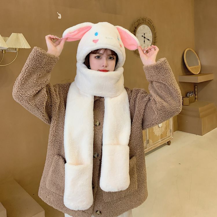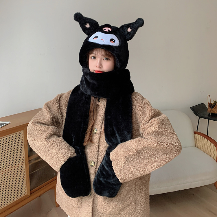 库米围巾帽子手套三件套一体秋冬学生显白防风保暖卡通毛毛黑围脖【MMKLM】