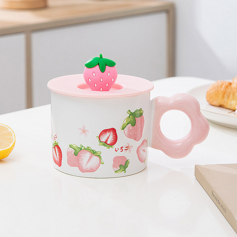可爱少女心陶瓷杯带盖草莓花朵学生水杯创意早餐杯高颜值情侣水杯【QJ015】