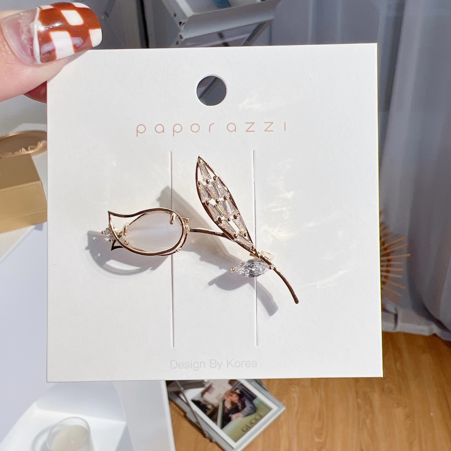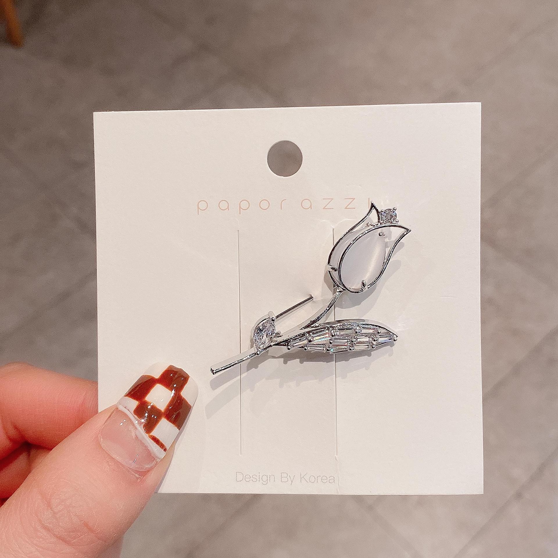镀白金轻奢风郁金香锆石花朵胸针女士气质猫眼石西装配饰树叶别针