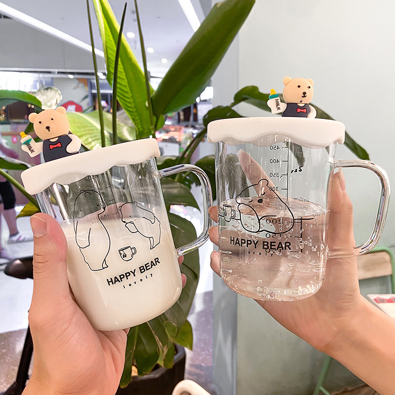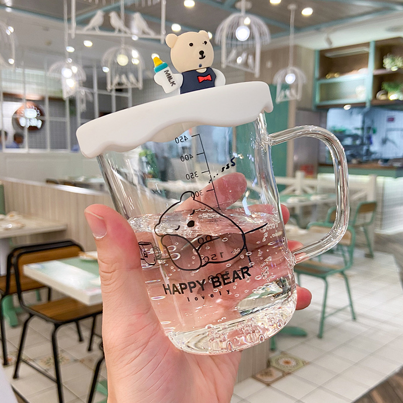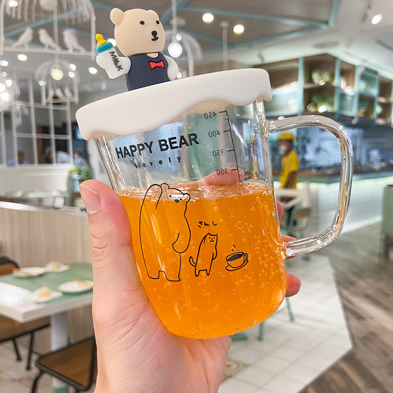 硅胶小熊带盖玻璃杯 Ins可爱卡通刻度牛奶杯450ML=YL-8021