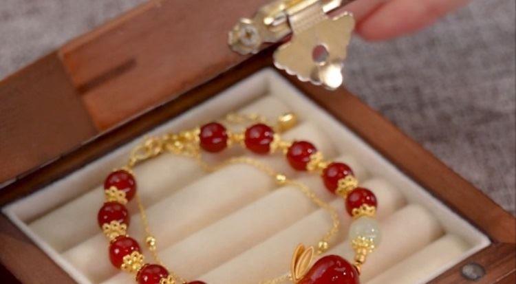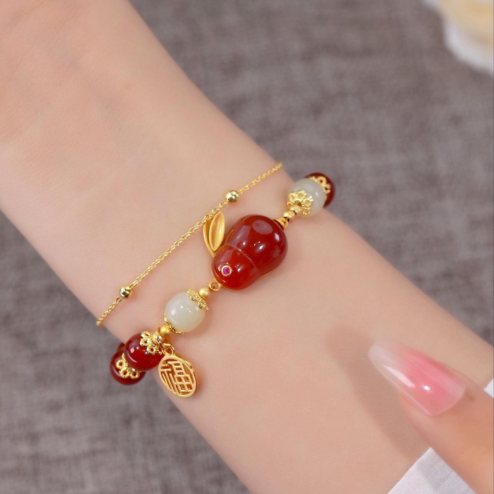 典润鸿兔送福天然红玛瑙双链叠戴玉兔手链中秋节礼物气质[TB680582009296]