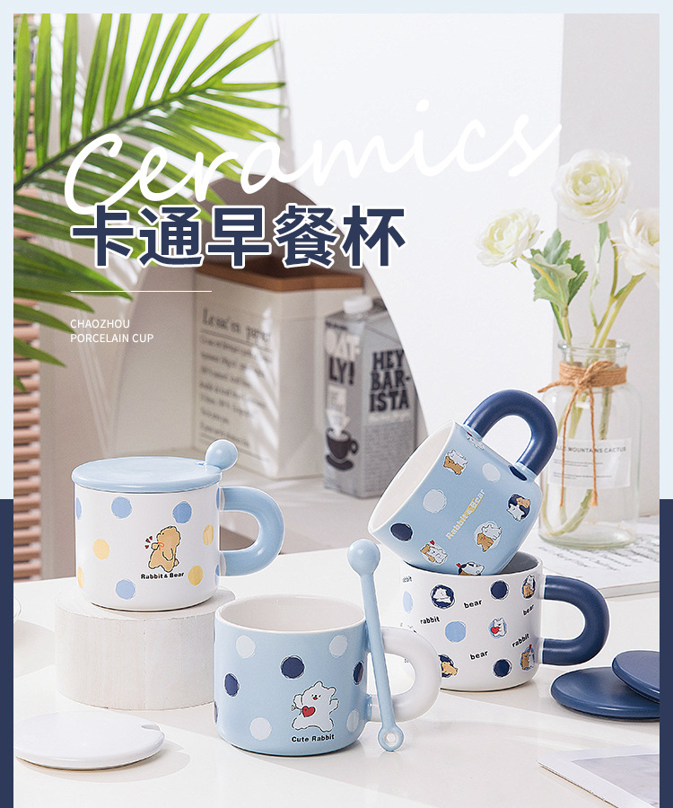 可爱卡通陶瓷杯高颜值兔熊狗狗马克杯带盖勺个性情侣喝水杯早餐杯【QJ017】