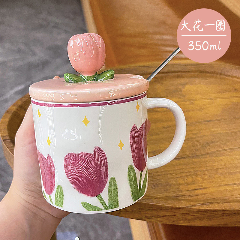 ins可爱郁金香水杯少女心学生礼物陶瓷杯带盖勺办公马克杯高颜值【 GB-055】