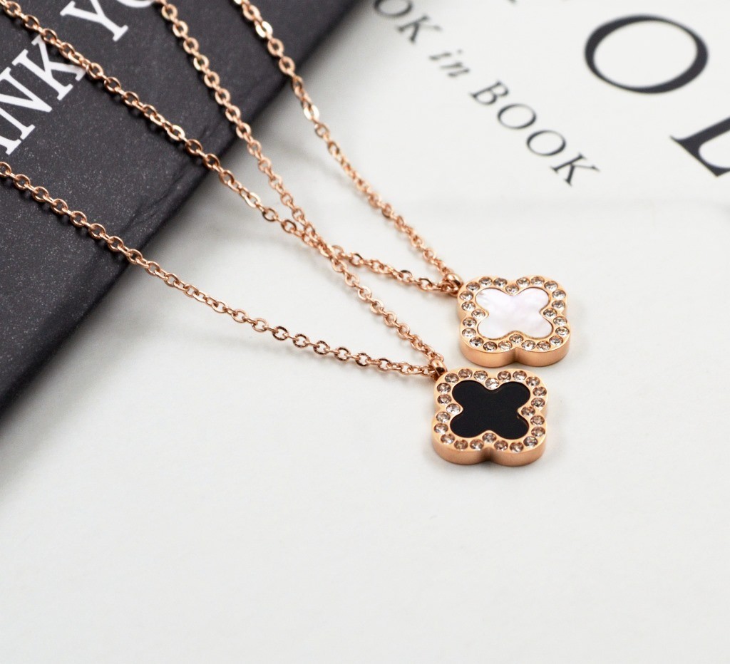 新款韩版时尚配饰钢玫瑰金黑白面四叶花项链锁女生首饰项饰=X86四叶草有钻黑面玫瑰金